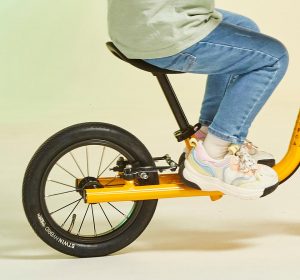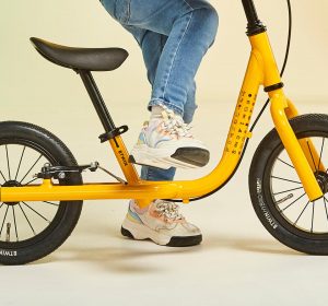 Notre haut de gamme allie facilité d’apprentissage (cadre bas et repose-pieds) et performance. Son cadre en aluminium et ses roues 12″ avec vrais pneus invitent à des balades plus engagées en famille.