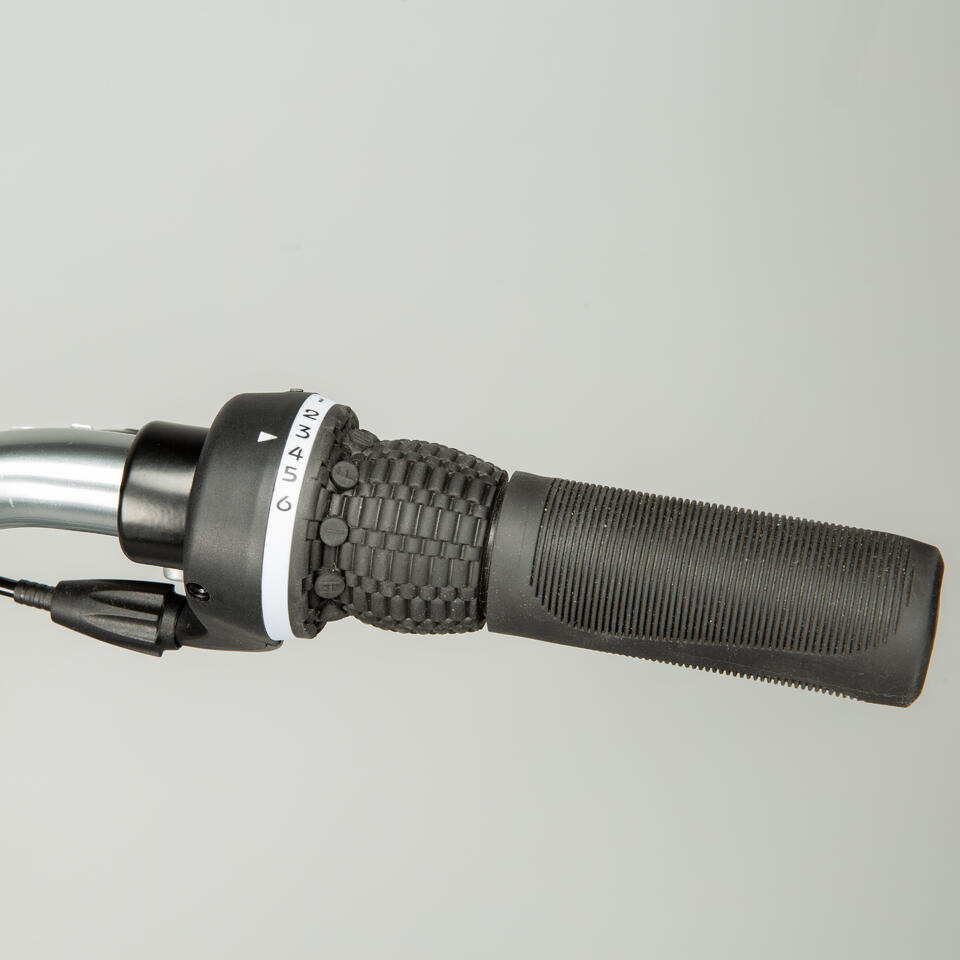 Transmission pédalier monoplateau 40 dents, manivelles acier 170mm, dérailleur à chape 6 vitesses actionnée par poignée tournante BTwin, Chaîne KMC anti-corrosion.