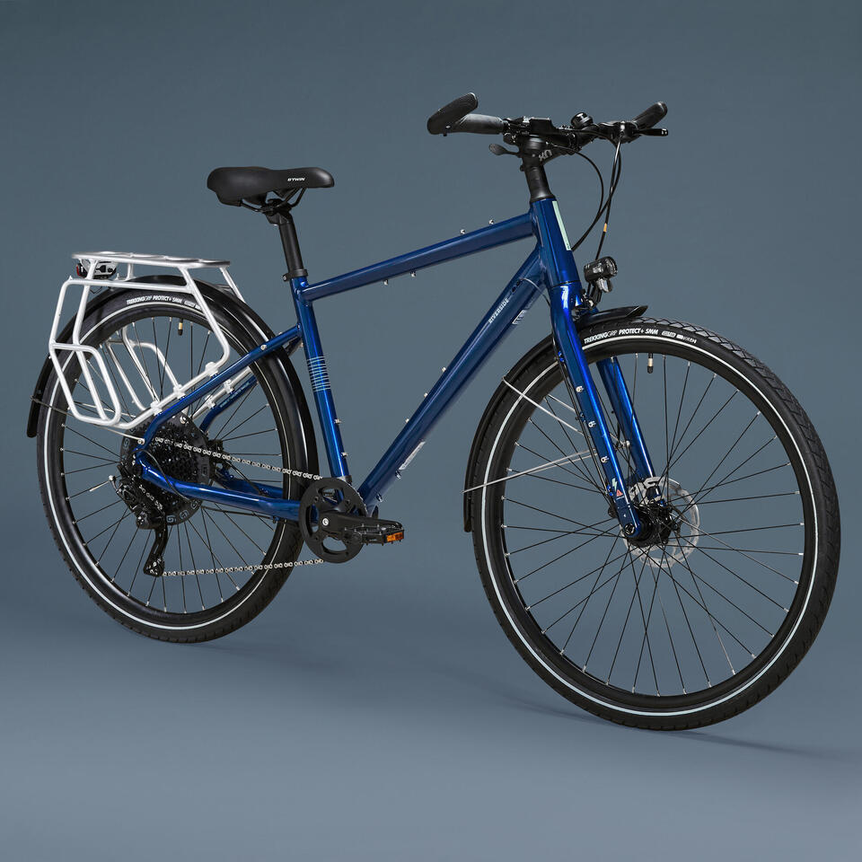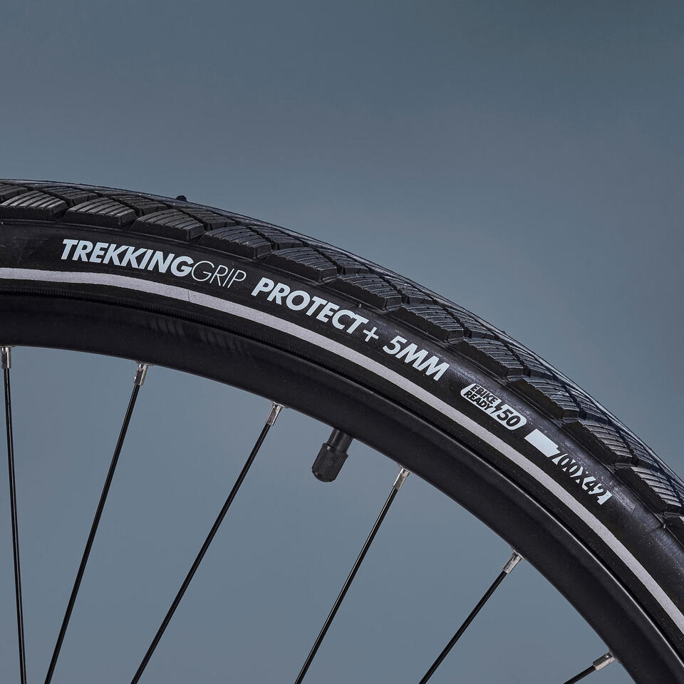 Nous avons choisi des pneus Btwin Trekking 9 Grip Protect+. Des pneus résistants à la crevaison grâce à leur bande anti-crevaison épaisse de 5mm en élastomère. Une accroche aussi efficace sur route que sur chemin, pour être à l’aise sur tous les terrains.