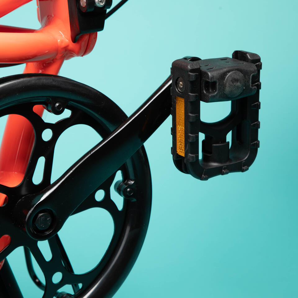 Pédales pliantes pour limiter l’encombrement du vélo plié.