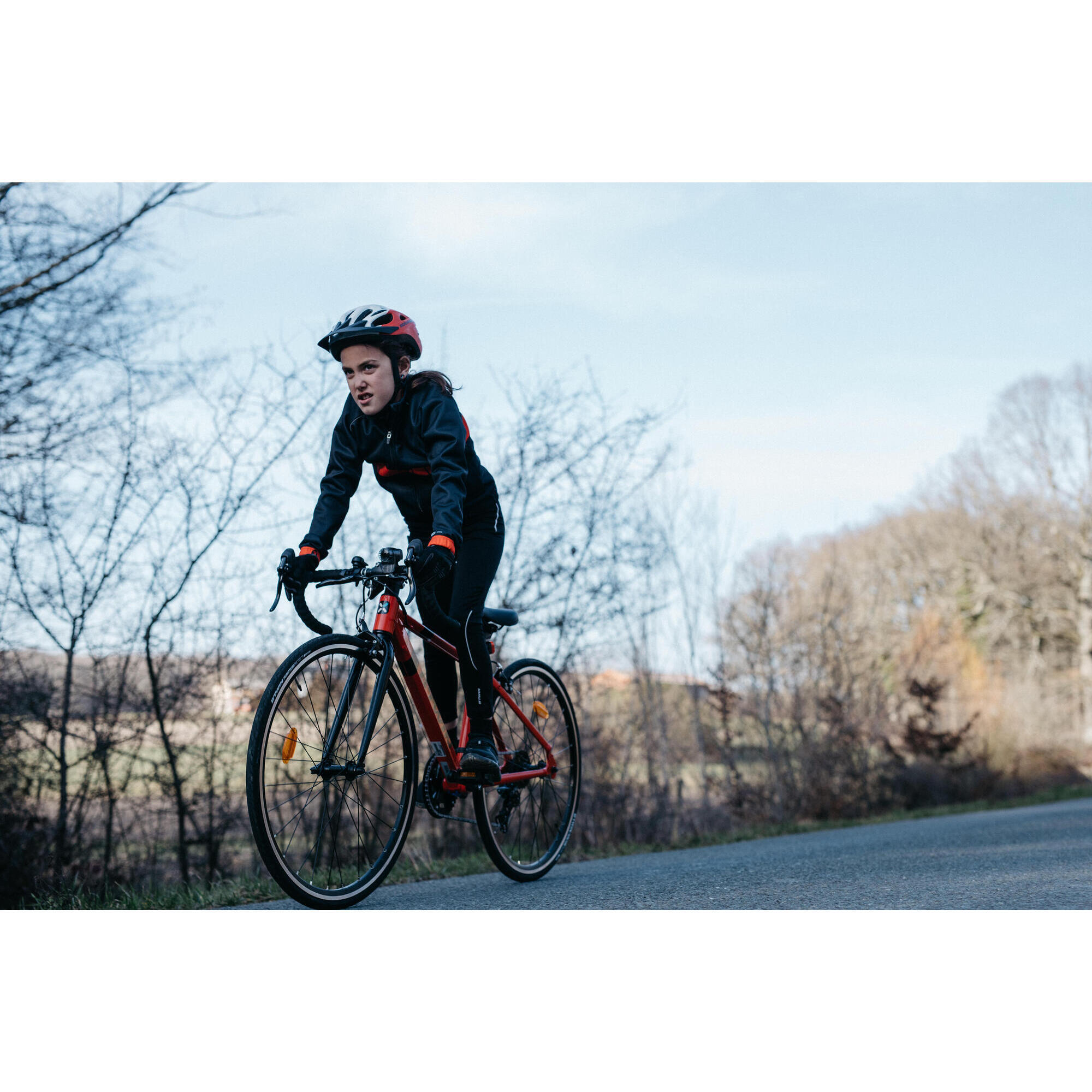 Pour apprendre le cyclisme sur route, nous avons équipé ce vélo route d’un cadre en aluminium, de grandes roues, d’une double commande de freinage et d’un cintre adapté à la largeur d’épaules