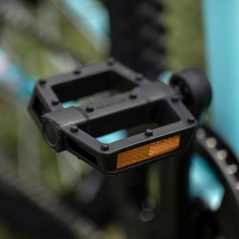 Ce VTT est équipé d’une sonnette, d’éclairages, de catadioptres de roues (réflecteurs) et de pédales plates.